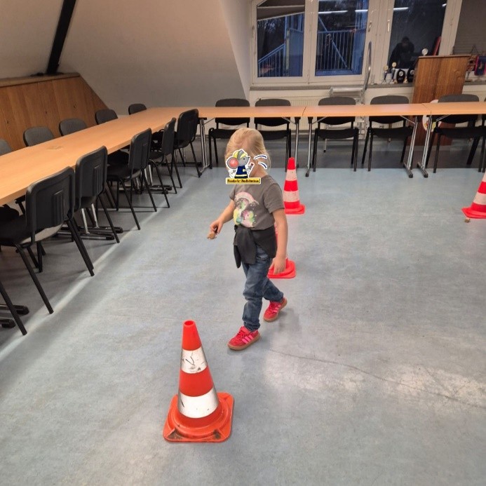 Für unser erstes Bewegungsspiel teilten sich die Kinder in zwei Gruppen auf und traten in Slalom-Wettrennen um Pylonen gegeneinander an.