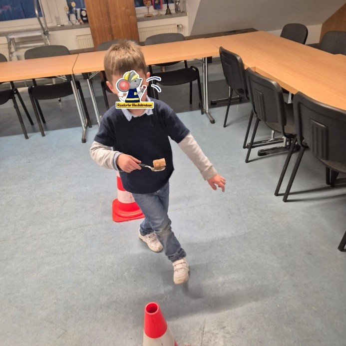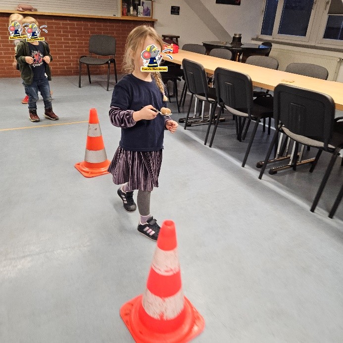 Anschließend erhielt jede Gruppe einen Ballon, der während des Laufens mitgenommen und an das nächste Kind weitergereicht werden musste. Danach bekamen die Gruppen jeweils einen Löffel, mit dem sie einen Ballon oder einen Korken um die Wette balancierten. Dabei waren Geschicklichkeit und Konzentration gefragt.