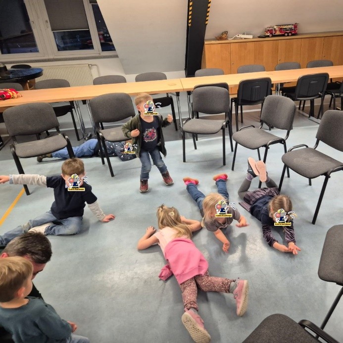 Feuer verließen die Kinder den Stuhlkreis und brachten sich in Sicherheit. Bei Wasserkletterten alle auf die Stühle, um keine nassen Füße zu bekommen. Bei Rauch legten sich die Kinder flach auf den Boden, um dem Rauch auszuweichen.