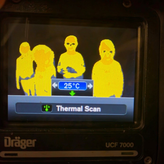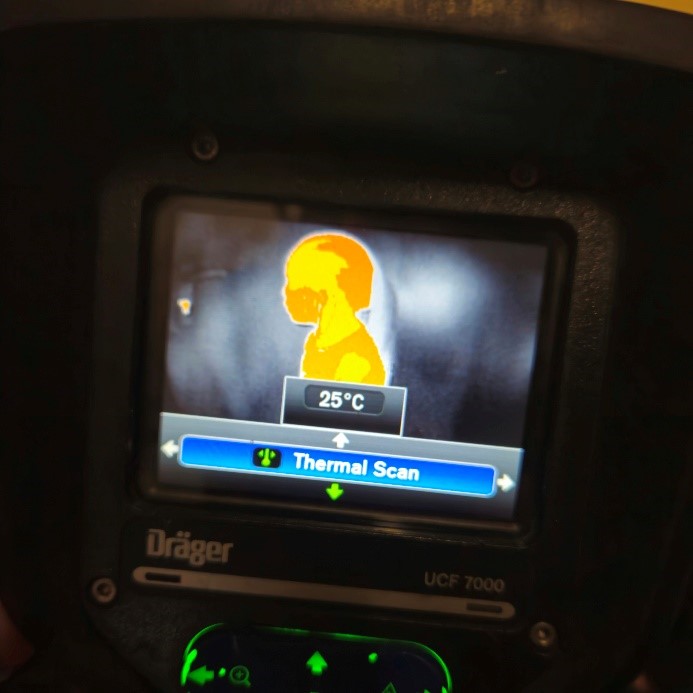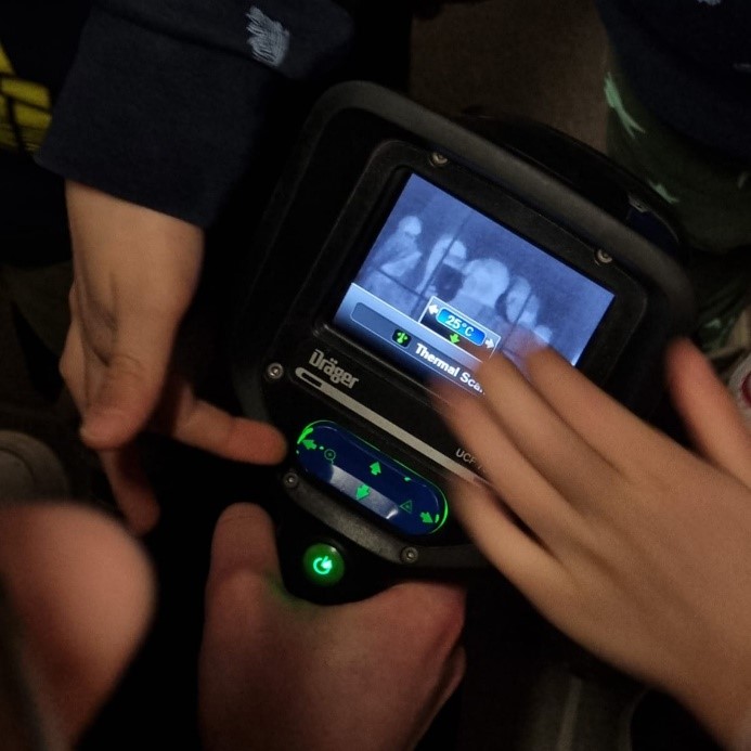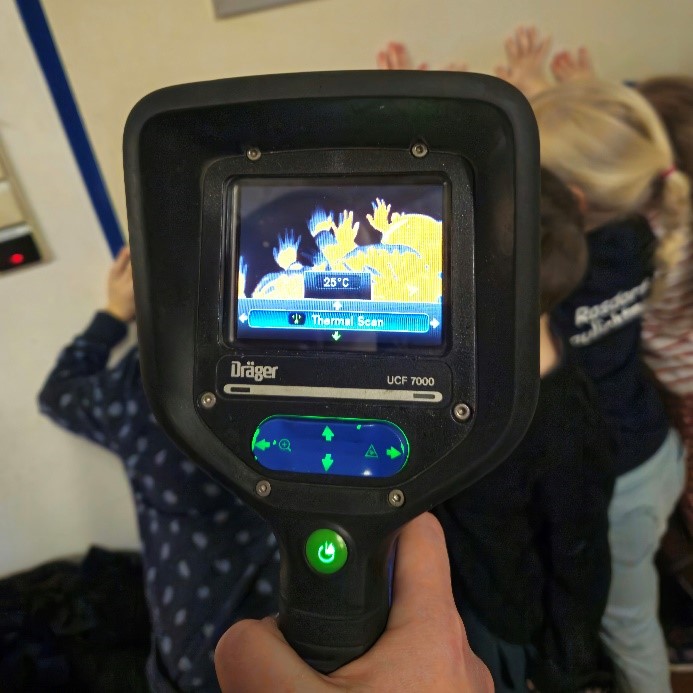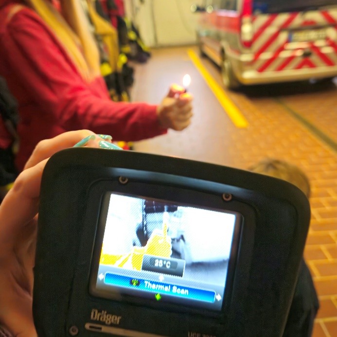 Zuerst betrachteten wir uns gegenseitig durch die Kamera und staunten über die verschiedenen Farben, die unsere Körperwärme sichtbar machten. Dann hinterließen wir Handabdrücke auf einer Tür, die auf dem Kamera Bildschirm leuchtend erschienen. Auch unsere Fahrzeughalle und ein Feuerzeug schauten wir uns durch die Kamera an. Im Anschluss spiegelten wir unsere Körperwärme auf einer Fliesenwand und sahen uns wie in einem Spiegel auf dem Bildschirm der Kamera.