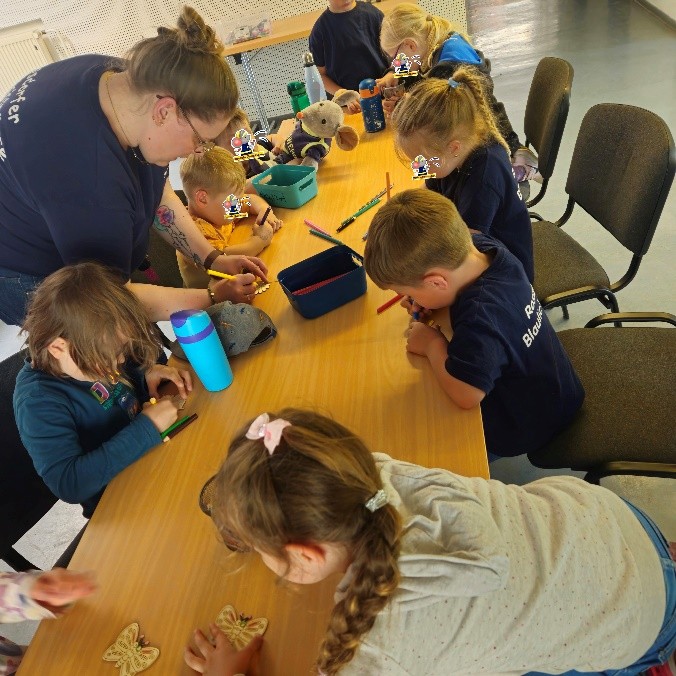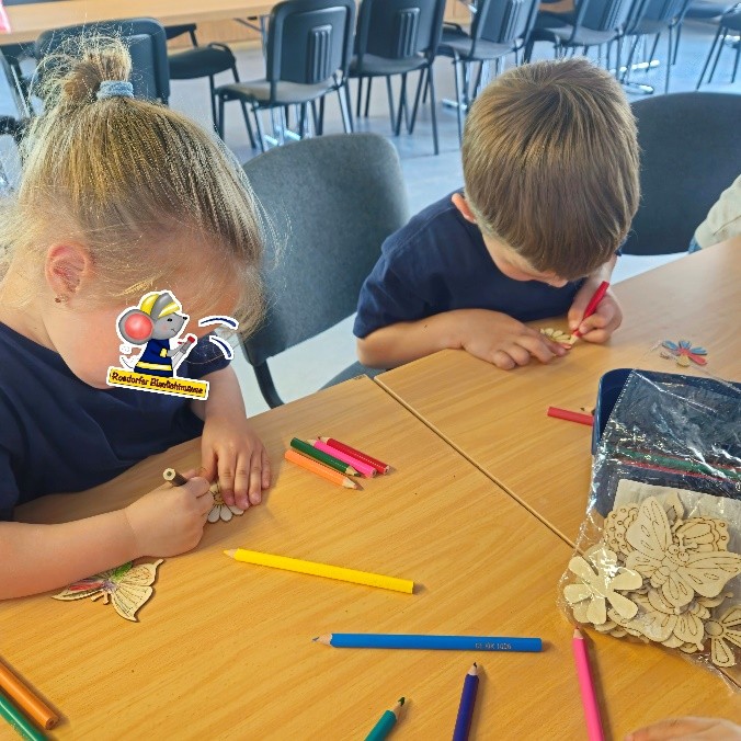 Bei den Blaulichtmäusen wurde es farbenfroh! Mit Buntstiften und ganz viel Kreativität gestalteten die Kinder bunte Blumen und fröhliche Schmetterlinge.