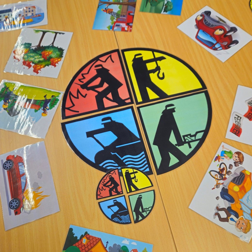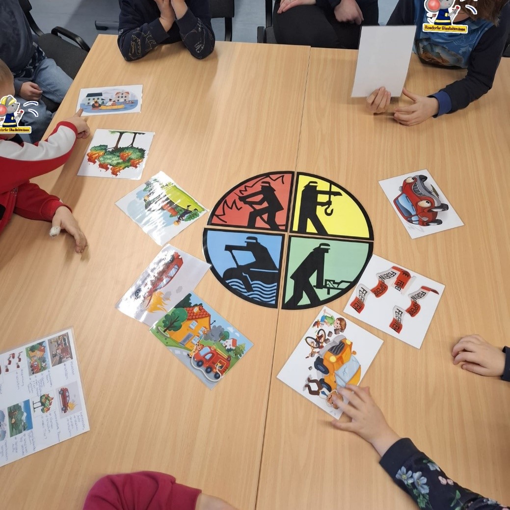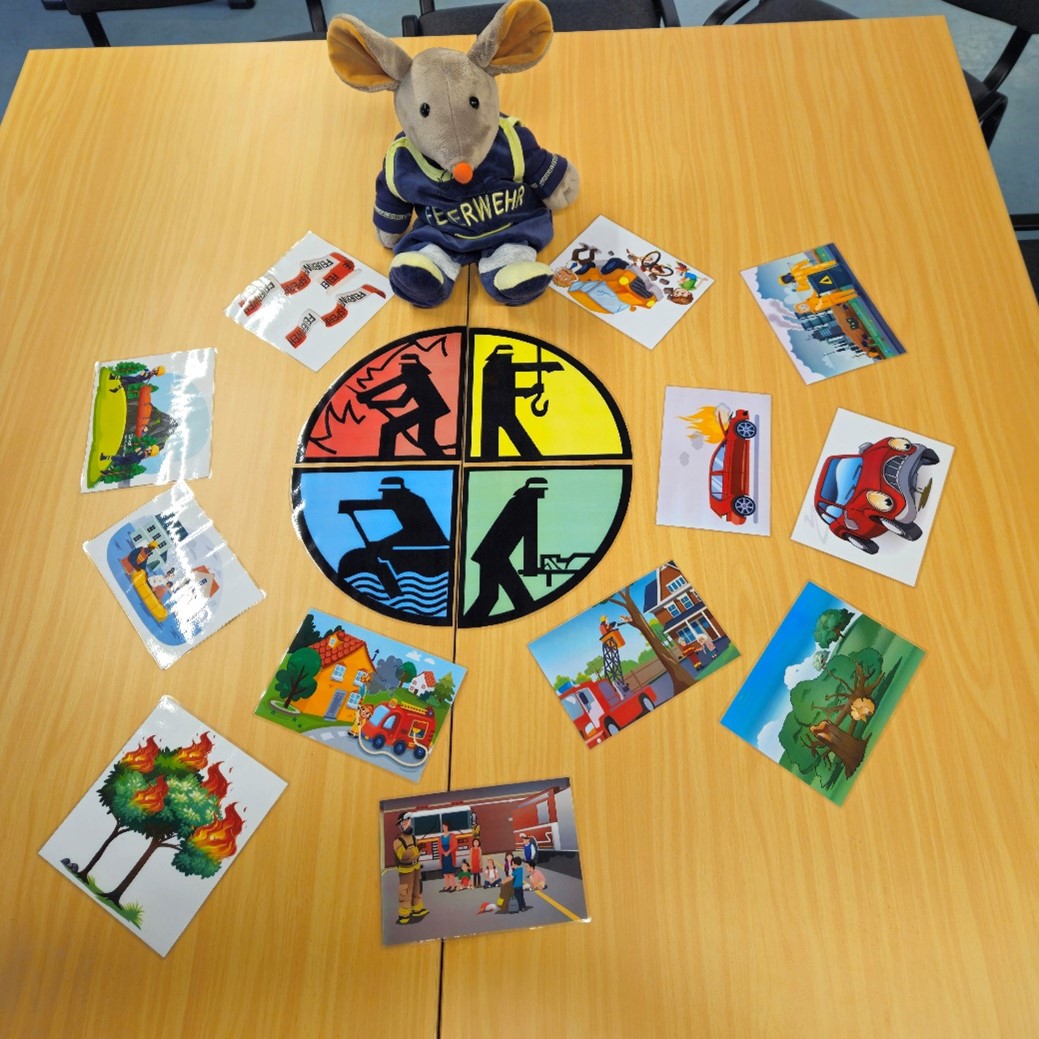 Im Rahmen dieses Dienstes haben wir mit den Kindern das Symbol der Feuerwehr (retten-löschen-bergen-schützen) besprochen. Um dies anschaulicher zu gestalten, haben wir den Kindern Beispielbilder gezeigt. Jedes Kind durfte sich ein Bild aussuchen. Gemeinsam haben wir besprochen, was auf den Bildern zu sehen ist und wie die Feuerwehr in den jeweiligen Situationen helfen kann. Anschließend erhielt jedes Kind ein eigenes Symbol, das es selbst zusammensetzen konnte und durfte es mit nach Hause nehmen.
