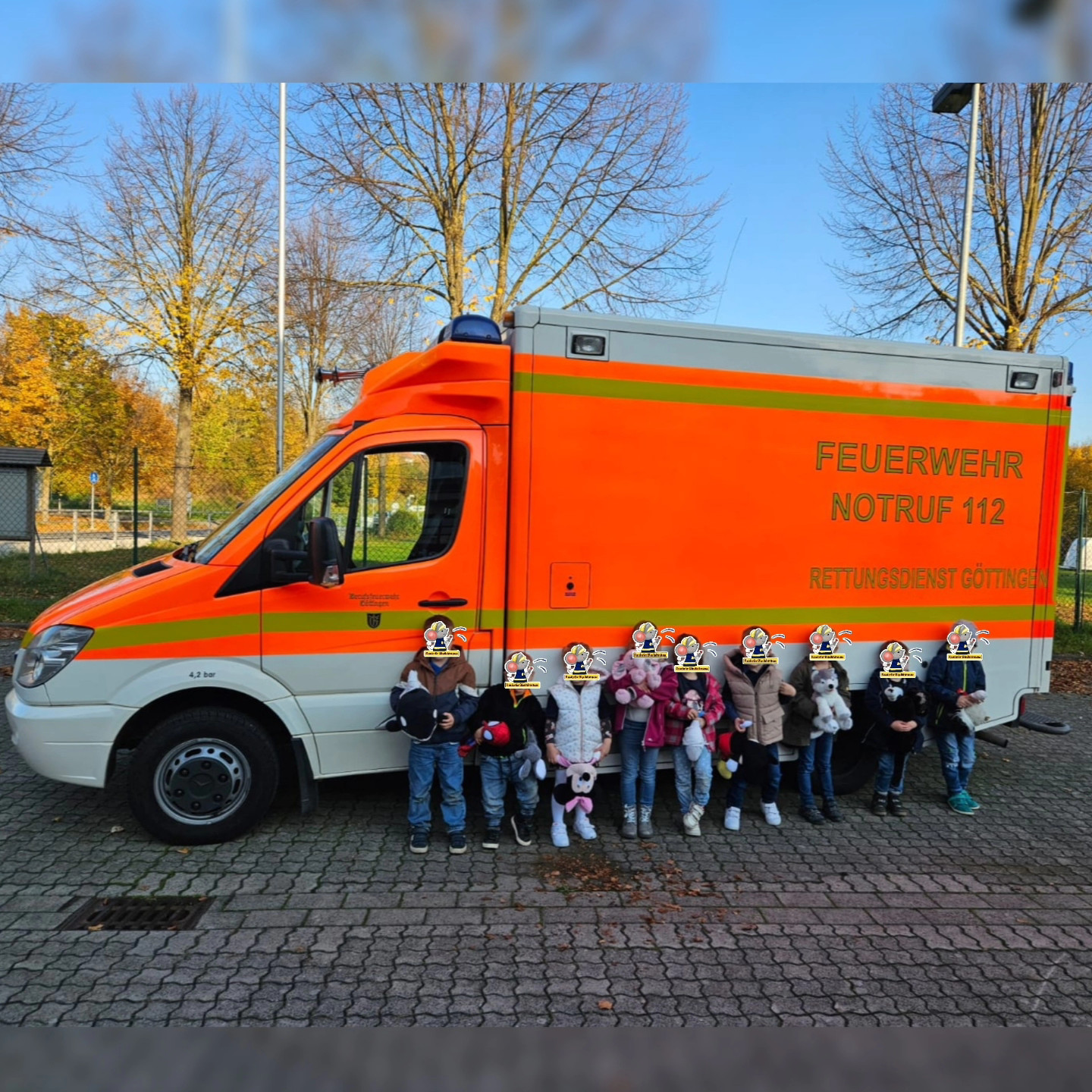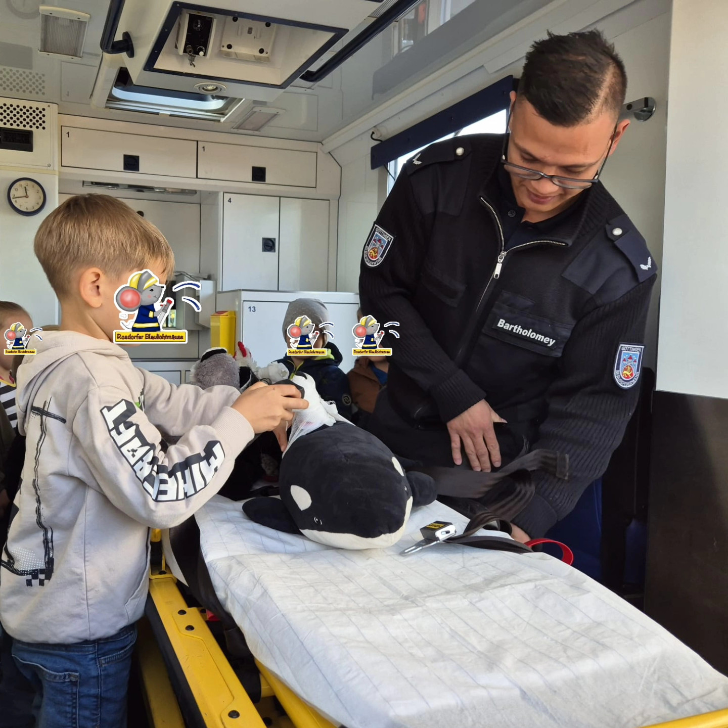 Anschließend hatten die Kinder die Gelegenheit mit ihren Kuscheltieren einen Rettungswagen zu besichtigen. Dort wurden die Kuscheltiere auf der Liege gesichert. Die Kinder konnten einige Dinge ausprobieren, wie zum Beispiel eine Sauerstoffmaske. Außerdem hatten sie die Möglichkeit, auf dem Fahrersitz Platz zu nehmen und das Blaulicht ein- und auszuschalten.